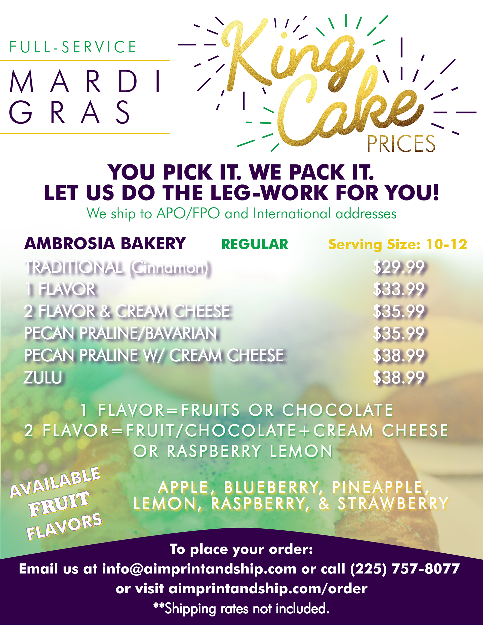 Full-Service King Cakes are by Ambrosia Bakery ONLY this year due to Calandro's on Perkins closing.